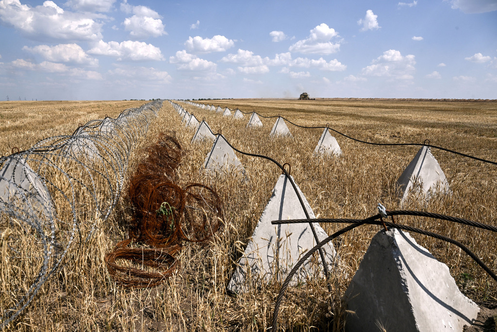 當(dāng)?shù)貢r間2025年7月8日,烏克蘭扎波羅熱州波洛希區(qū)奧里希夫市,聯(lián)合收割機正在收割谷物。田里的金字塔形反坦克障礙物(龍齒)和鐵絲網(wǎng)是為了保護農(nóng)田免受俄羅斯無人機襲擊。視覺中國 圖