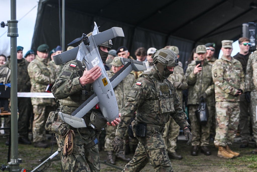 當(dāng)?shù)貢r間2025年11月18日,波蘭新德巴,北約反無人機系統(tǒng)實彈演習(xí)期間,一名波蘭士兵攜帶Merops無人機。此次演習(xí)由波蘭國防部主辦,波蘭士兵與羅馬尼亞和美國軍隊完成了在烏克蘭成功使用的反無人機系統(tǒng)訓(xùn)練。北約成員國波蘭和羅馬尼亞部署了這些系統(tǒng),作為“東方哨兵行動”的一部分,這是北約對俄羅斯無人機近期侵入歐洲領(lǐng)空的回應(yīng)。視覺中國 圖