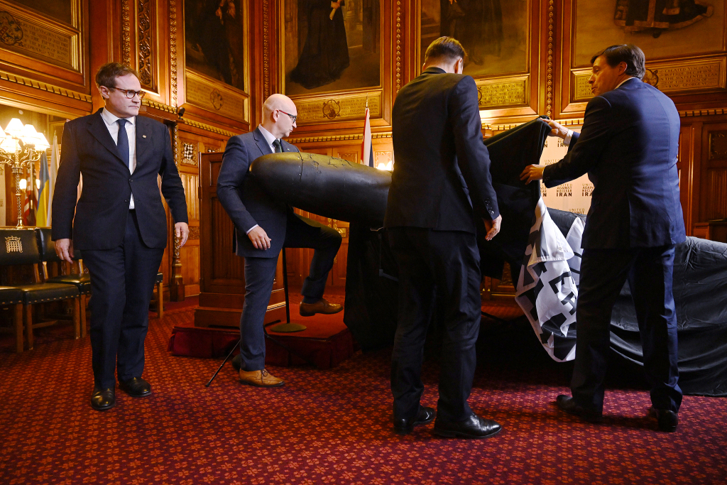 當(dāng)?shù)貢r間2025年10月14日,英國倫敦,湯布里奇議員湯姆·圖根達特(左)在議會大廈觀看一架被擊落的伊朗制造的“見證者-136”攻擊型無人機。該無人機被俄羅斯用于俄烏沖突中。視覺中國 圖