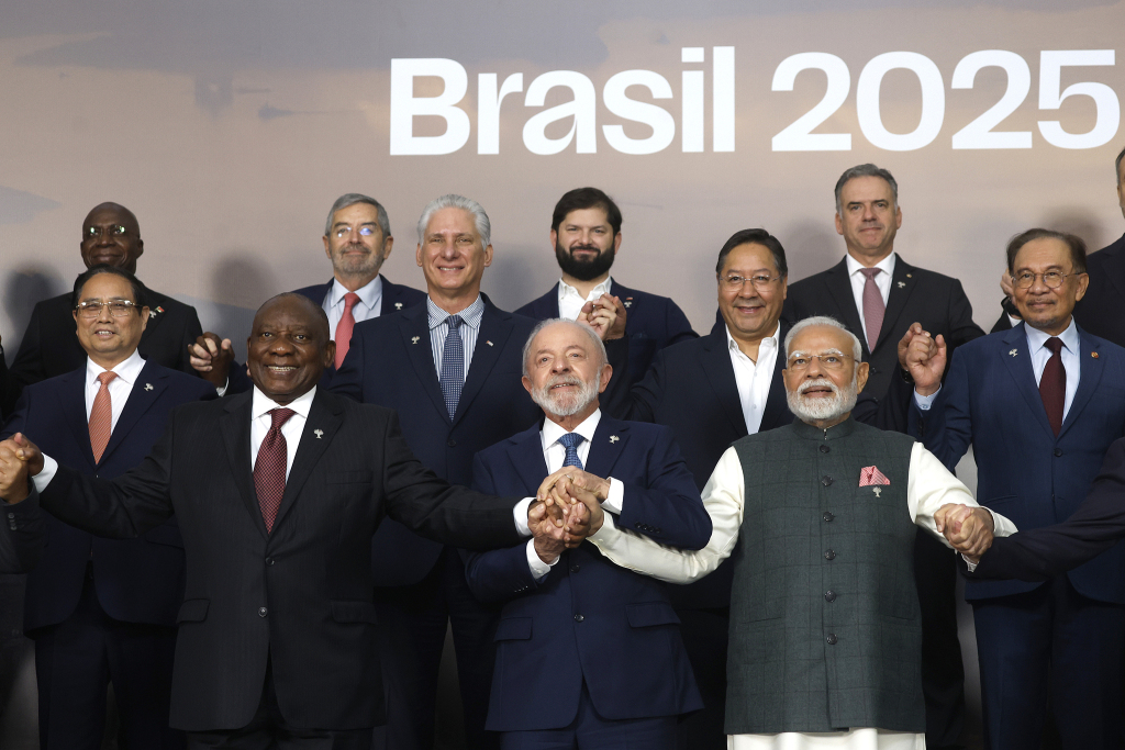 當(dāng)?shù)貢r間2025年7月7日,巴西里約熱內(nèi)盧,(前排左起)金磚國家領(lǐng)導(dǎo)人峰會期間,南非總統(tǒng)西里爾·拉馬福薩、巴西總統(tǒng)盧拉和印度總理莫迪出席合影。本次會晤主題是“加強全球南方合作,促進更加包容和可持續(xù)的治理”。會議宣言強調(diào)堅持通過對話協(xié)商和外交途徑以和平方式解決國家間的分歧和爭端。視覺中國 圖