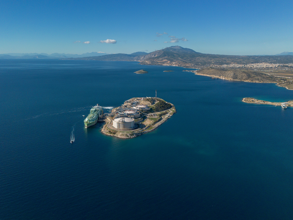 當(dāng)?shù)貢r間2025年12月1日,希臘梅加拉,液化天然氣運輸船“BW MAGNOLIA”號在雅典附近的雷維蘇薩碼頭卸載來自美國的液化天然氣。該船從美國查爾斯湖港出發(fā)。隨著歐盟計劃在2027年前逐步停止進口俄羅斯液化天然氣,希臘正成為美國液化天然氣出口的主要區(qū)域樞紐。視覺中國 圖