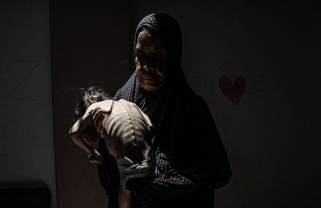 當(dāng)?shù)貢r間2025年7月31日,加沙地帶加沙城,6歲的米斯克·馬德洪體重僅4公斤,因饑餓導(dǎo)致腦萎縮和嚴(yán)重營養(yǎng)不良。視覺中國 圖