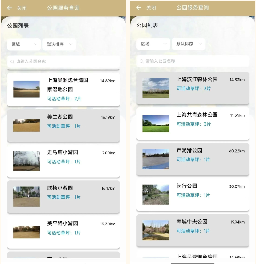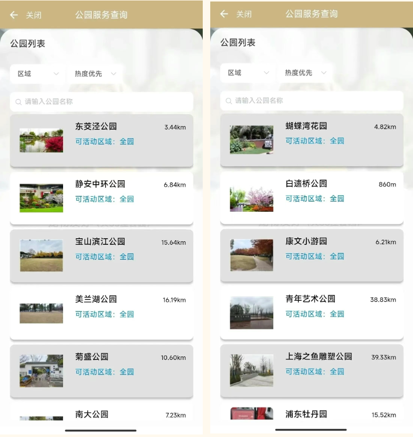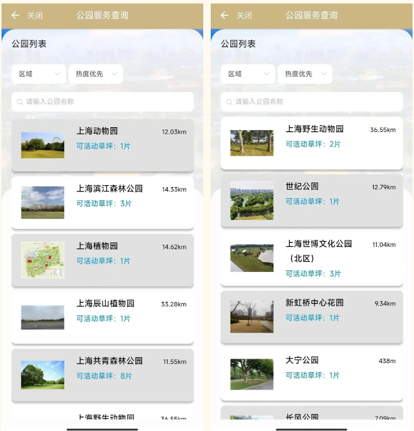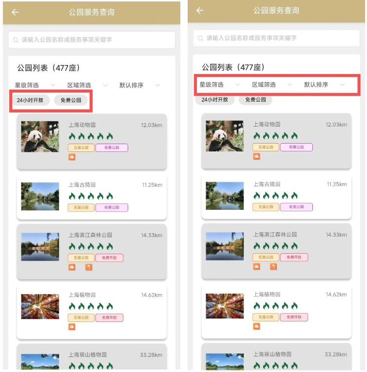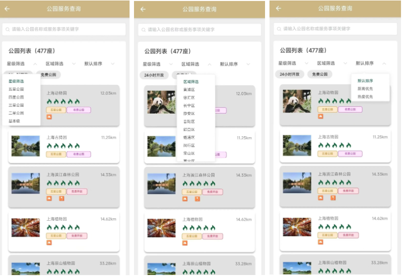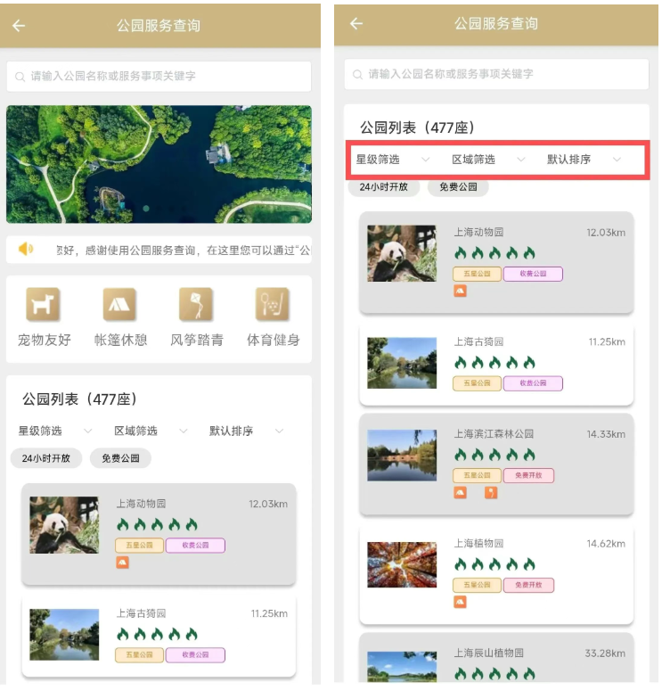 第二步:進(jìn)入服務(wù)后,可以按照星級、區(qū)域進(jìn)行條件篩選查找心儀的公園。