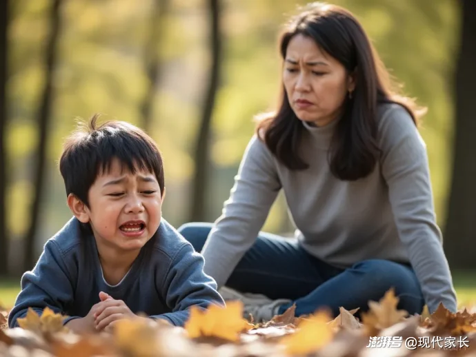 小男孩依然趴在地上哭,伸出一只手讓媽媽拉他。媽媽沒有拉他,堅(jiān)持叫他自己站起來。