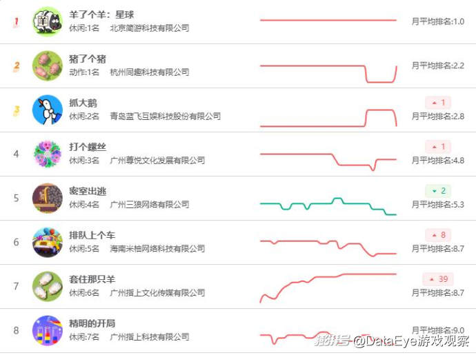 廣州指上《套住那只羊》在11月表現(xiàn)突出,排名飆升39名,沖入月榜TOP10。廈門螢火科技旗下的《狙擊外星人》最新上線了PVP新玩法“你狙我躲”,聯(lián)機PK玩法帶動下排名飆升49名。