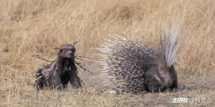 你時(shí)常還能看到蜜獾抓捕豪豬,被扎得滿身斷刺的景象,活像那只“蜜蜂小狗”。