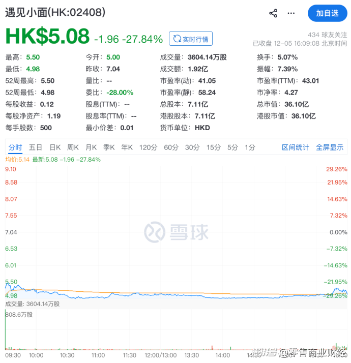 12月5日,港交所迎來(lái)“中式面館第一股”。遇見(jiàn)小面開(kāi)盤(pán)報(bào)5港元,較每股7.04港元的發(fā)行價(jià)大幅低開(kāi)28.98%,打破了近期新股上市普遍上漲的勢(shì)頭,且首日表現(xiàn)不及預(yù)期,最終當(dāng)天收?qǐng)?bào)5.08港元/股,跌27.84%,總市值36.1億港元。