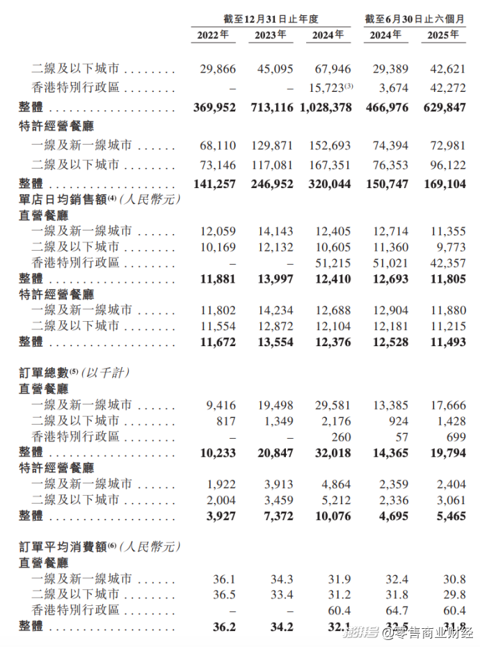面條作為中國(guó)人日常主食之一,遇見(jiàn)小面的核心產(chǎn)品市場(chǎng)認(rèn)可度較高。根據(jù)弗若斯特沙利文報(bào)告,2022年至2024年,遇見(jiàn)小面的重慶小面、紅碗豌雜面、金碗酸辣粉線下銷(xiāo)量連續(xù)三年位居行業(yè)第一;2024年以0.5%的市場(chǎng)份額位列中國(guó)中式面館經(jīng)營(yíng)者第四,同時(shí)也是最大的川渝風(fēng)味面館經(jīng)營(yíng)者。單店數(shù)據(jù)方面,2025年上半年直營(yíng)餐廳單店日均銷(xiāo)售額11805元,客單價(jià)穩(wěn)定在32元左右,在中式快餐行業(yè)屬于中等偏上水平。