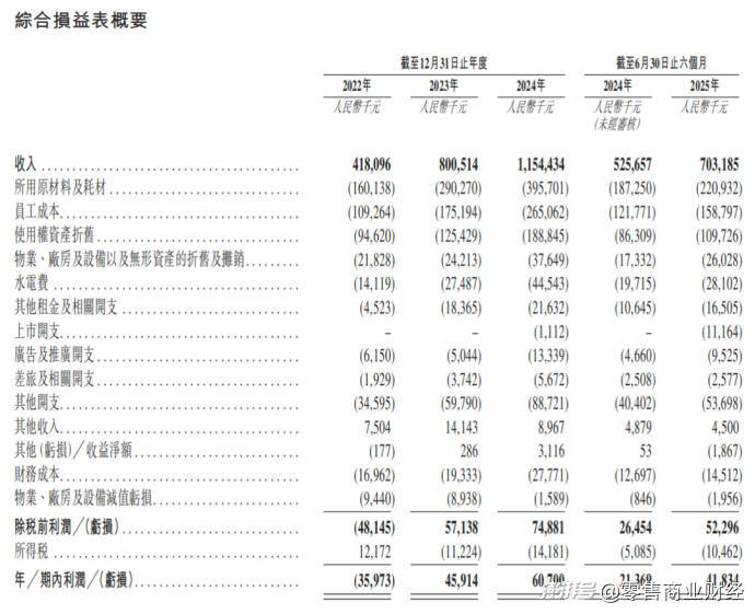 門(mén)店快速增長(zhǎng)的同時(shí),營(yíng)收表現(xiàn)同樣亮眼。財(cái)務(wù)數(shù)據(jù)顯示,2022年至2024年,遇見(jiàn)小面營(yíng)收從4.18億元增至11.54億元,年復(fù)合增長(zhǎng)率達(dá)66.2%;2025年上半年?duì)I收7.03億元,同比增長(zhǎng)33.8%。盈利端實(shí)現(xiàn)扭虧為盈,2022年受疫情影響凈虧損3597萬(wàn)元,2023年盈利4591萬(wàn)元,2024年盈利6070萬(wàn)元,2025年上半年盈利4183萬(wàn)元。