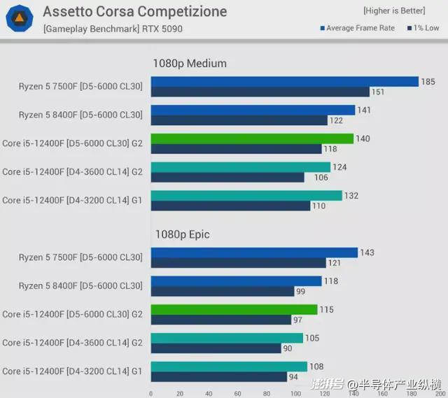 根據(jù)以往的測試,我們發(fā)現(xiàn) ACC(與 Counter-Strike 類似)對系統(tǒng)內(nèi)存性能(無論是延遲還是帶寬)并不十分敏感。ACC 對 CPU 緩存性能非常敏感,3D V-Cache 處理器就是一個很好的例子。但就 DDR4 和 DDR5 而言,性能提升相當(dāng)有限。在本次測試中,12400F 的性能提升最高僅為 13%。