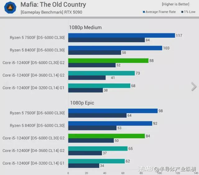 《黑手黨:舊國度》是一款新游戲,在12400F上的運行效果本來就不如Ryzen 5 7500F,甚至不如配置更低的8400F。升級到DDR4內(nèi)存對Core i5來說并沒有幫助,因為在中等畫質(zhì)下DDR5內(nèi)存的速度提升了21%,在最高畫質(zhì)下更是提升了29%,這再次表明更高的畫質(zhì)預(yù)設(shè)會增加CPU負(fù)載。