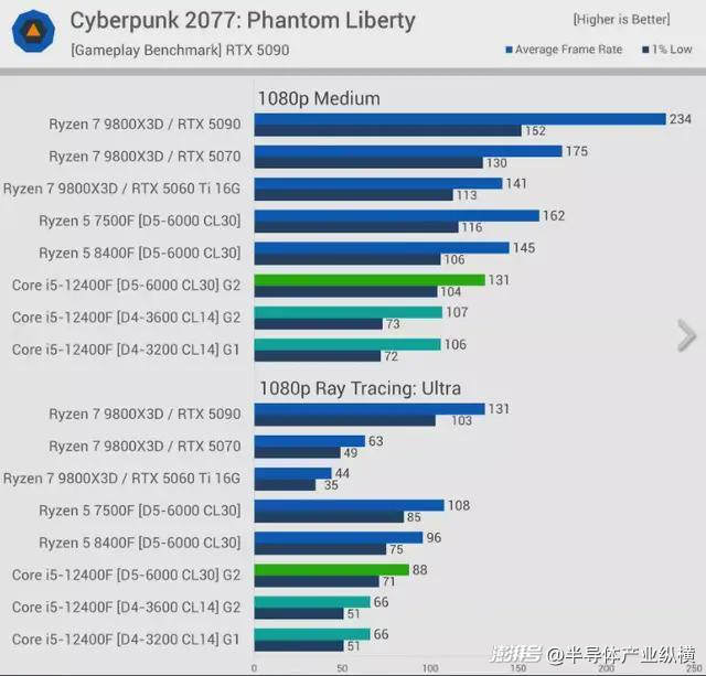 《賽博朋克2077》會大量占用系統(tǒng)內(nèi)存帶寬。在中等畫質(zhì)預(yù)設(shè)下,從DDR4升級到DDR5后,性能提升高達24%。這與之前在Core i5-14600K、12600K、Core i9-12900K和14900K等CPU上的測試結(jié)果相符。