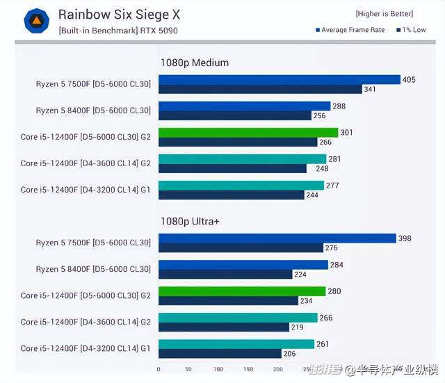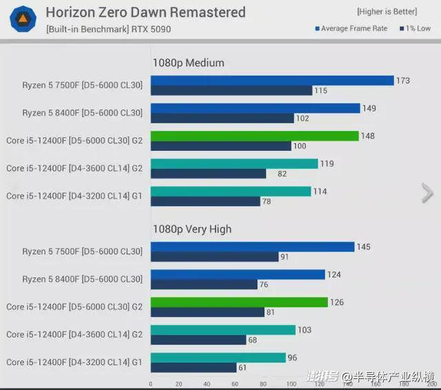 即使在最高畫質(zhì)下,使用 DDR5 內(nèi)存而非 DDR4 內(nèi)存時,12400F 的性能平均提升仍然達到 20%。這也意味著,雖然 7500F 在 DDR5 內(nèi)存下比 12400F 快 18%,但如果 Core i5 受限于 DDR4 內(nèi)存,其性能提升幅度可達 41%。