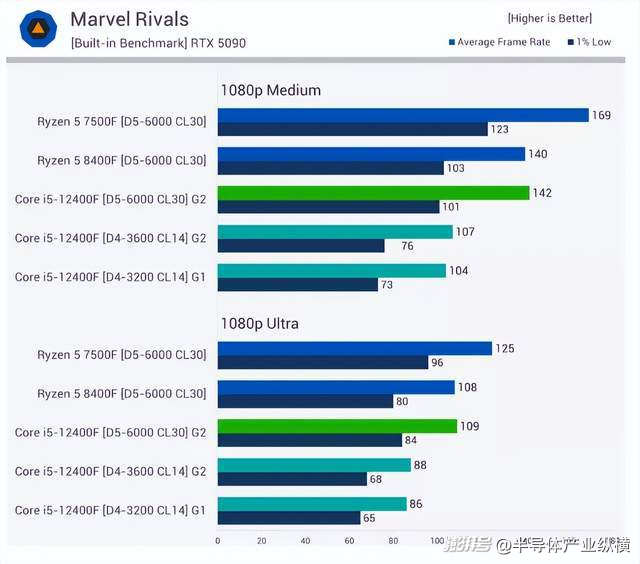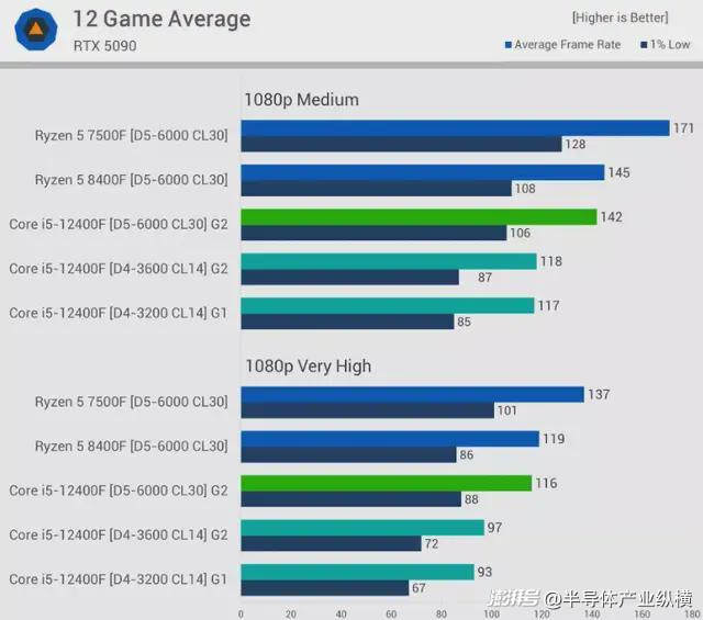以下是12款游戲的平均性能測試結(jié)果,從中等畫質(zhì)設(shè)置開始。使用DDR5內(nèi)存時,12400F的性能與8400F相當(dāng),這意味著7500F的性能提升了約20%。12400F在DDR5內(nèi)存下的平均性能也比DDR4內(nèi)存下高出20%。這意味著,如果使用DDR4內(nèi)存,7500F的平均性能提升幅度約為45%——這是一個巨大的差距。