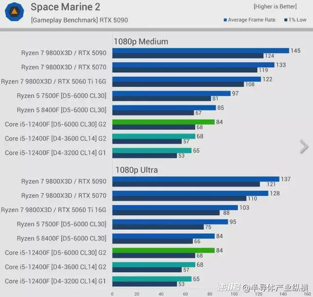 《太空陸戰(zhàn)隊2》是一款對CPU要求極高的游戲。在這款游戲中,配備DDR5內(nèi)存的12400F性能提升顯著,在中等或超高畫質(zhì)設(shè)置下均提升了24%。需要注意的是,該數(shù)據(jù)很大程度上受限于CPU性能,這意味著任何能夠在您所選設(shè)置下達到80幀的GPU都能帶來類似的性能提升。很多人對CPU測試存在誤解:它最關(guān)注的是幀率,而非其他因素。