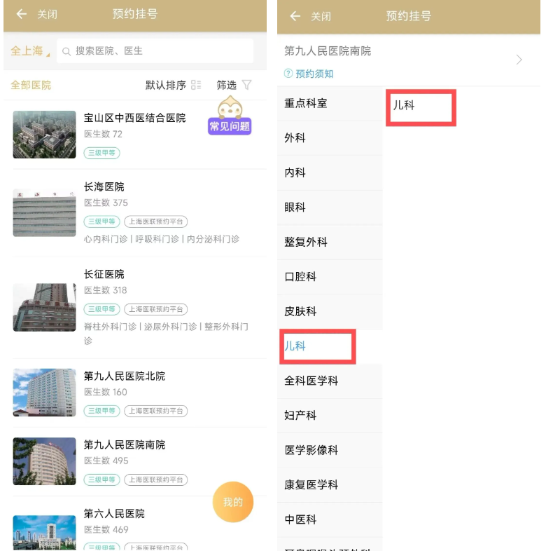 第二步:搜索想去的醫(yī)院,也可按條件進(jìn)行篩選(按距離、醫(yī)院等級(jí)篩選),隨后點(diǎn)擊進(jìn)入科室頁(yè)面選擇目標(biāo)科室。
