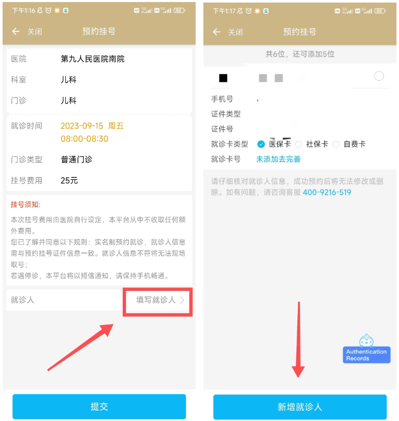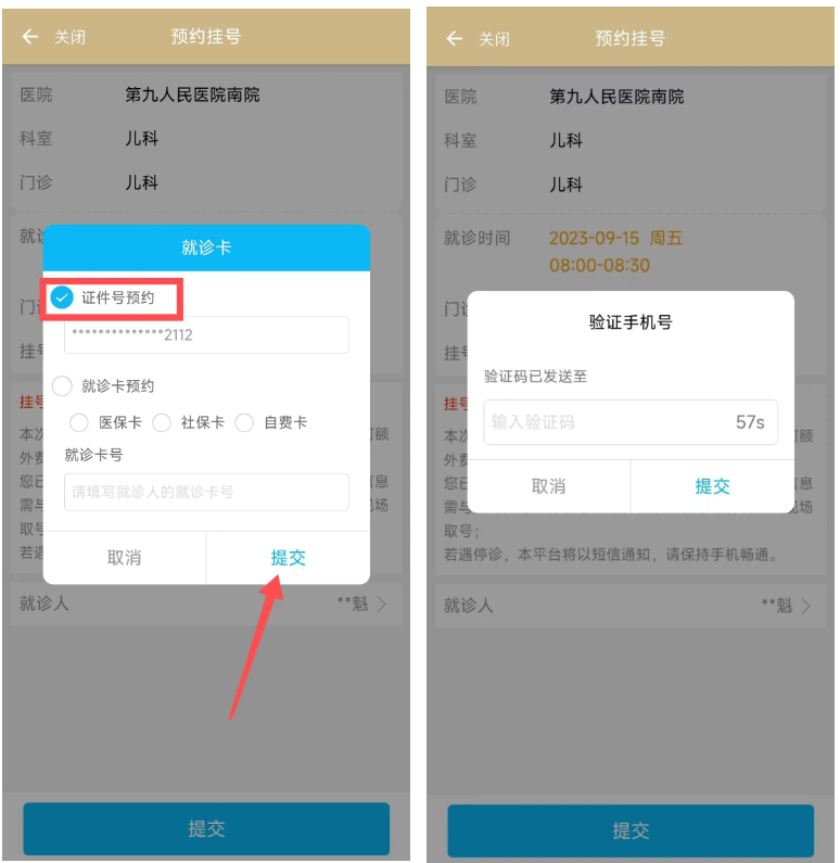 第五步:填寫完就診人信息,請(qǐng)點(diǎn)擊“提交”(可選擇證件號(hào)或就診卡進(jìn)行預(yù)約),輸入收到的手機(jī)驗(yàn)證碼即可。