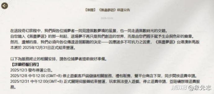 2025 年末,象先志觀察到快手自研手游《無盡夢回》臺港澳新馬版本正式停服 —— 這款曾創(chuàng)下單日 300 萬下載、 App Store 免費榜霸榜 6 天的產(chǎn)品,最終因用戶留存不足 5% 黯然退場,為其 8 年游戲探索再添遺憾。