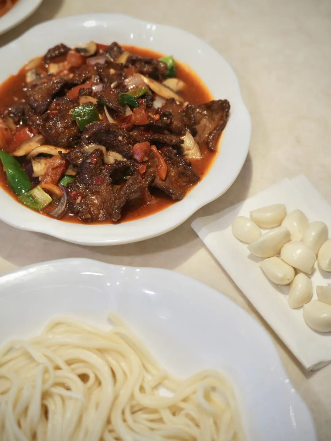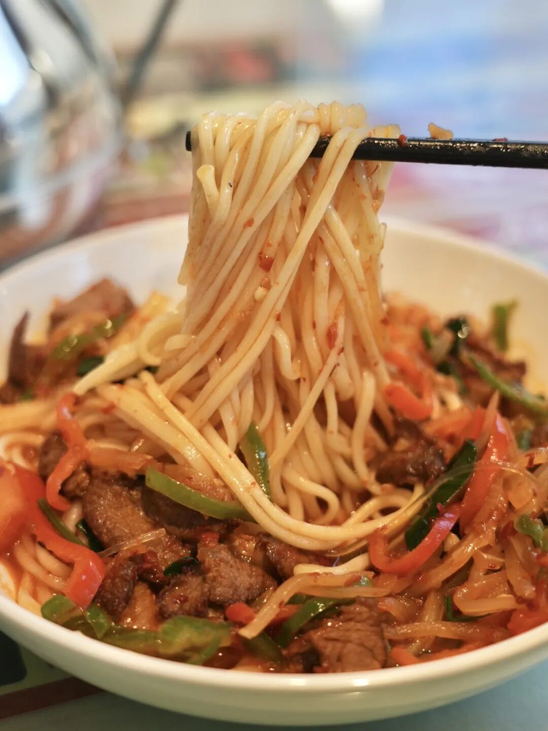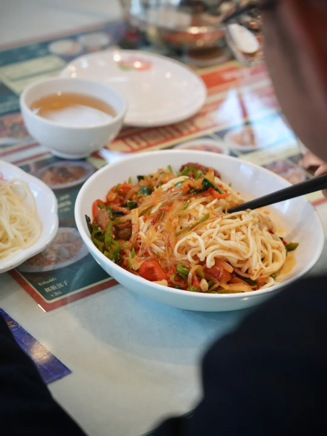 土豆絲、粉條、辣椒,牛肉,洋蔥……數(shù)不清的配菜碼在一起,濃稠油亮。