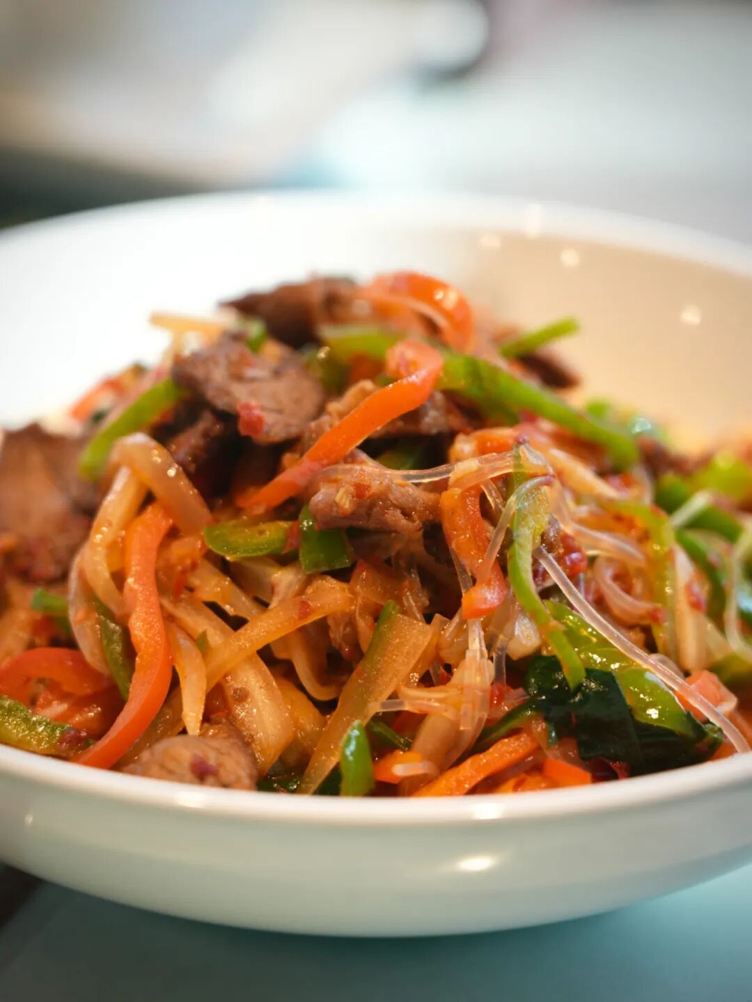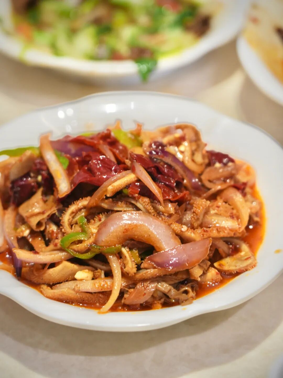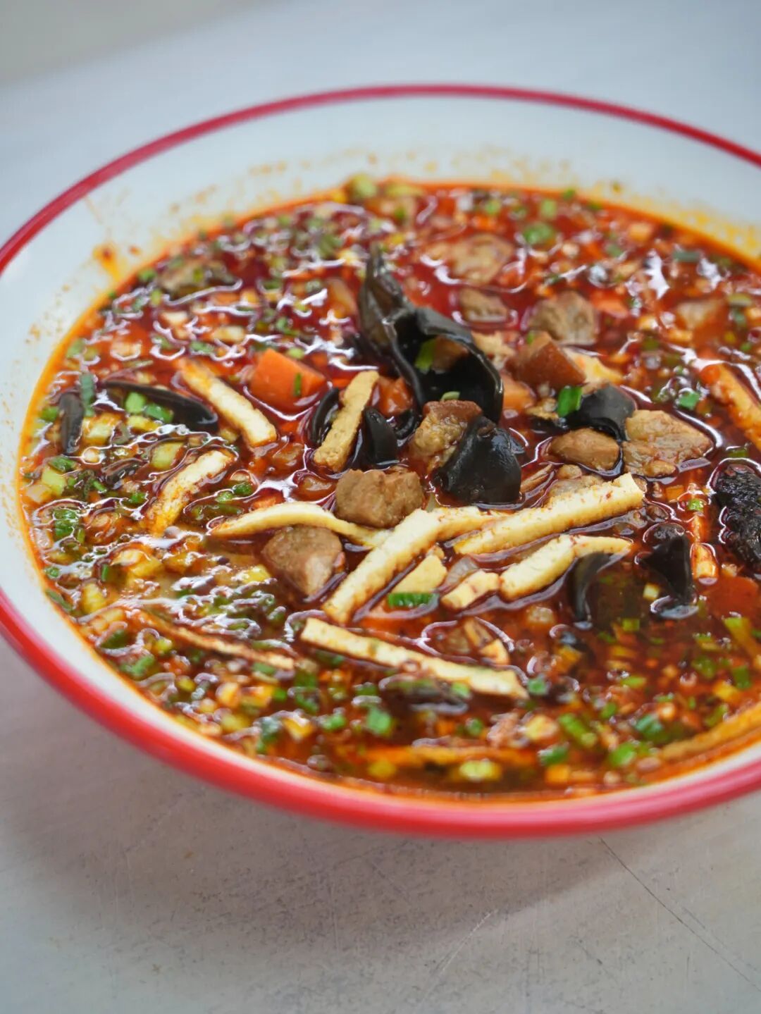 土豆絲、粉條、辣椒,牛肉,洋蔥……數(shù)不清的配菜碼在一起,濃稠油亮。