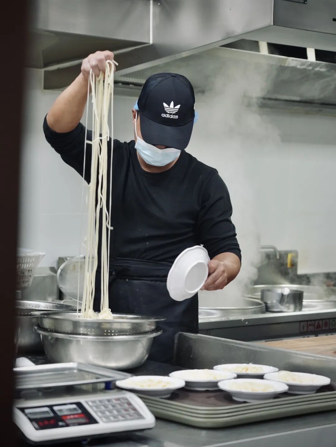 三個阿姨在廚房里撈面、澆湯、撒料,動作利落。
