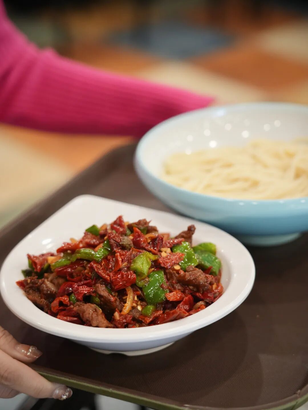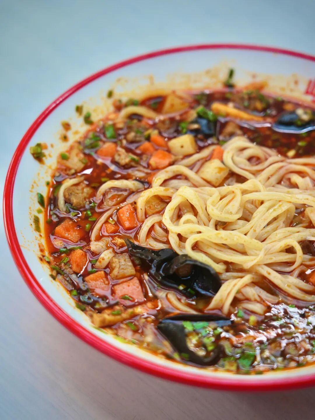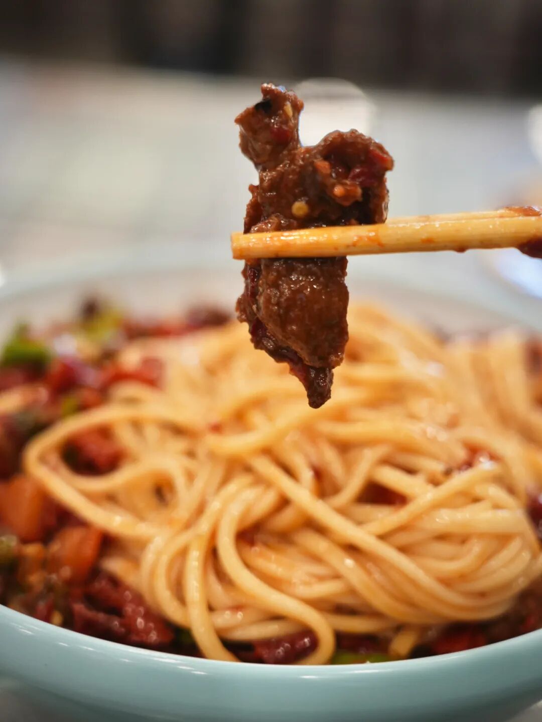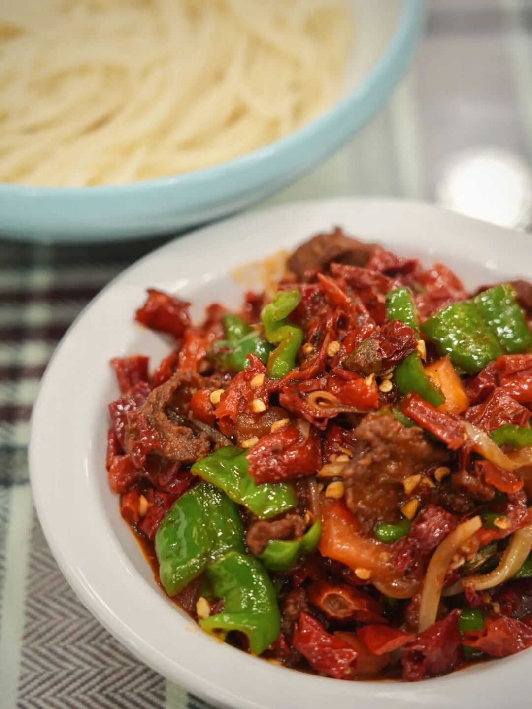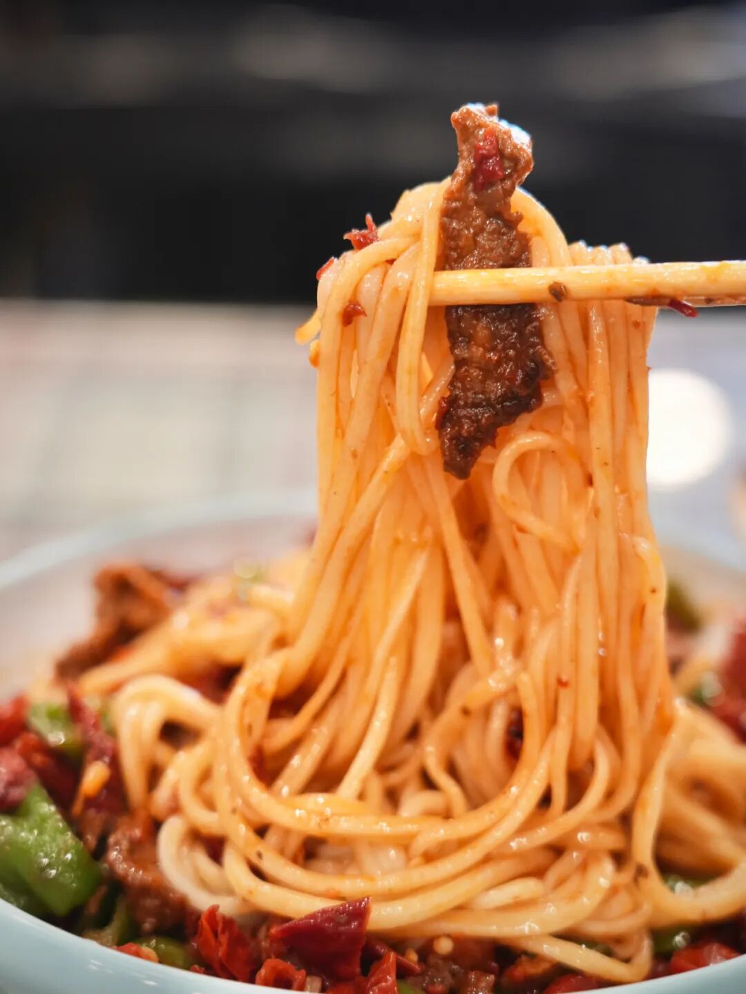 辣子肉拌面是招牌之一,焦香隨著面一同而來。