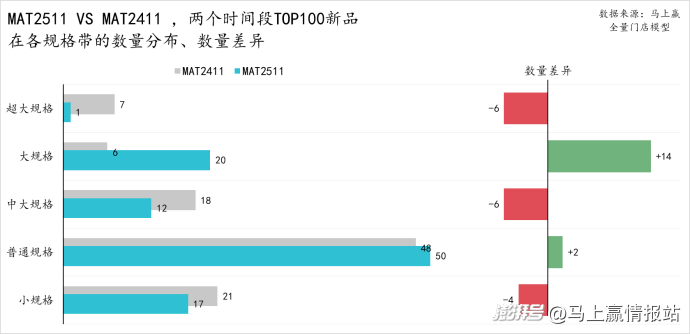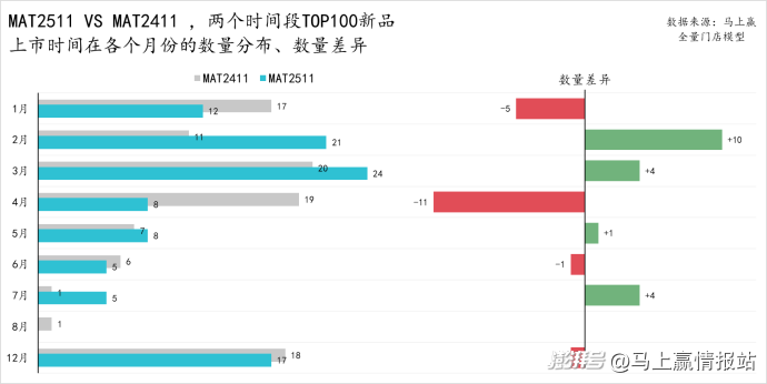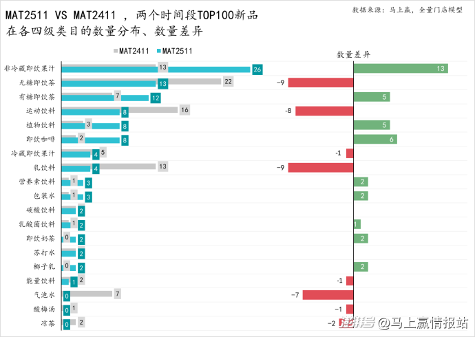 從MAT2511、MAT2411兩個(gè)時(shí)間段TOP100新品在各四級(jí)類(lèi)目中的分布數(shù)量和兩個(gè)時(shí)間段的差異來(lái)看: