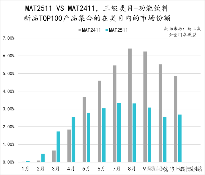 從功能飲料類(lèi)目?jī)?nèi)TOP新品集合的各月市場(chǎng)份額來(lái)看,MAT2511相比MAT2411市場(chǎng)份額出現(xiàn)了一定程度的萎縮。但在2025年11月,MAT2511的TOP新品份額有一定的增長(zhǎng)趨勢(shì)。