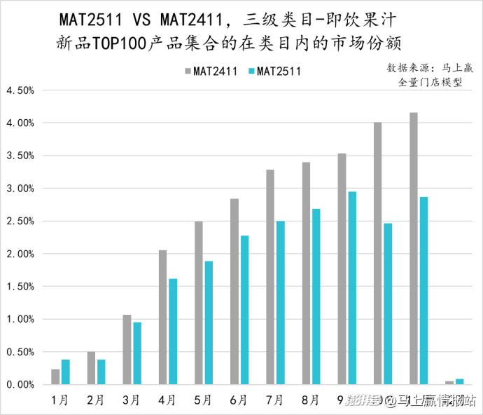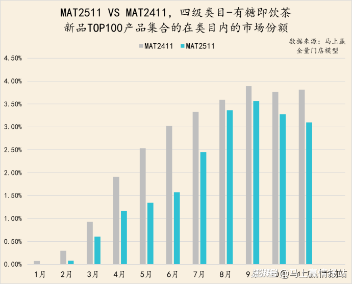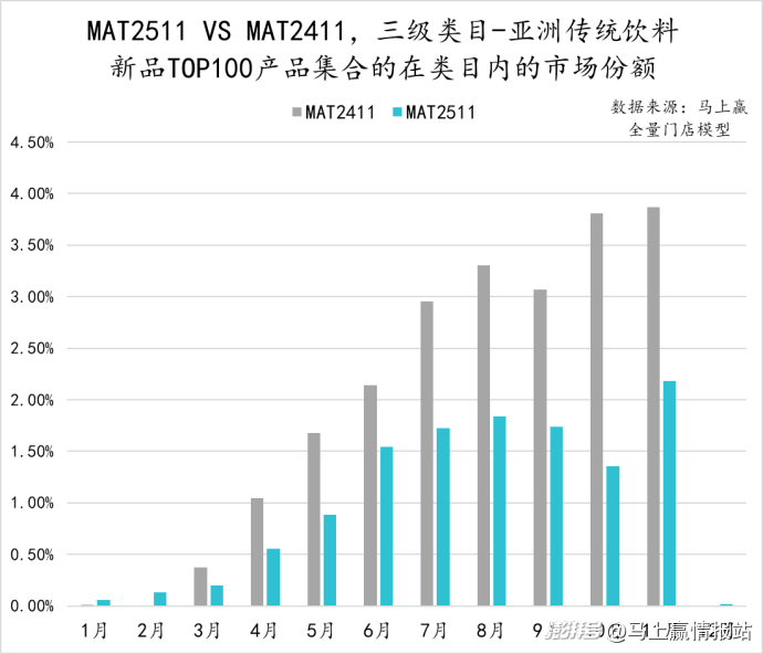 從亞洲傳統(tǒng)飲料類(lèi)目中,TOP100新品的市場(chǎng)表現(xiàn)來(lái)看,MAT2511的TOP新品集合的市場(chǎng)份額表現(xiàn)明顯弱于MAT2411的TOP新品表現(xiàn),除11月外其他月份均未超過(guò)2%。