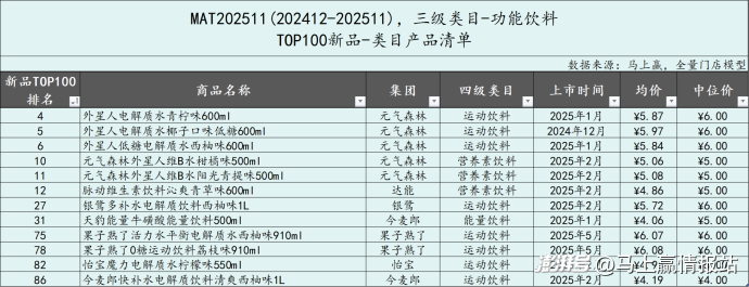 相比來(lái)說(shuō),無(wú)糖即飲茶、運(yùn)動(dòng)飲料、乳飲料和氣泡水的TOP100新品數(shù)量則出現(xiàn)明顯萎縮。無(wú)糖即飲茶在MAT2411為T(mén)OP100新品數(shù)量最多的類(lèi)目,但在MAT2511僅剩13款,銳減9款。乳飲料也隨著2024年輿情事件的逐漸平息,回歸傳統(tǒng)、略顯陳舊的理性市場(chǎng),或?qū)τ陬?lèi)目的新品數(shù)量和新品成長(zhǎng)性、競(jìng)爭(zhēng)力均有一定的波動(dòng)影響;值得關(guān)注的是運(yùn)動(dòng)飲料,其今年進(jìn)入TOP100新品的產(chǎn)品數(shù)量相比去年腰斬,但類(lèi)目整體的占比、銷(xiāo)售額同比增速卻依然快速增長(zhǎng),或與類(lèi)目集中度進(jìn)一步提升、巨頭對(duì)于類(lèi)目的掌控力進(jìn)一步加強(qiáng)有一定的關(guān)系。