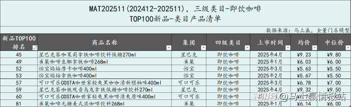 即飲咖啡類(lèi)目,MAT2511共有8款產(chǎn)品進(jìn)入TOP100新品行列,其中星巴克、雀巢、怡寶和可口可樂(lè)分別有2款產(chǎn)品上榜。產(chǎn)品規(guī)格從268ml到400ml集中于小規(guī)格,價(jià)格則從5.5-9.8元不等跨度較大。從產(chǎn)品標(biāo)簽來(lái)看,3款為低糖/無(wú)糖產(chǎn)品,或是該類(lèi)目?jī)?nèi)產(chǎn)品創(chuàng)新的方向之一。