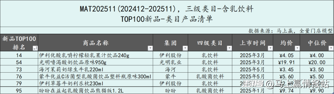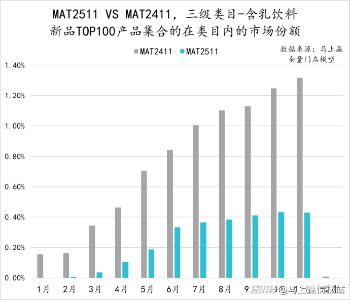 從含乳飲料類(lèi)目中TOP100新品的市場(chǎng)表現(xiàn)來(lái)看,相比MAT2411,MAT2511時(shí)間段的新品在類(lèi)目?jī)?nèi)的成長(zhǎng)明顯更差,在大多數(shù)月份,MAT2511的TOP100新品的市場(chǎng)份額不足MAT2411的三分之一,或可說(shuō)明過(guò)去一年,類(lèi)目新品表現(xiàn)、成長(zhǎng)性相比之前更差。