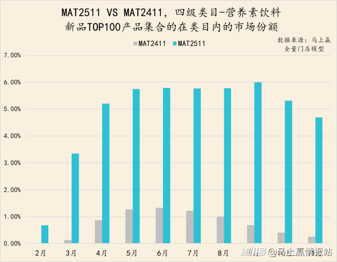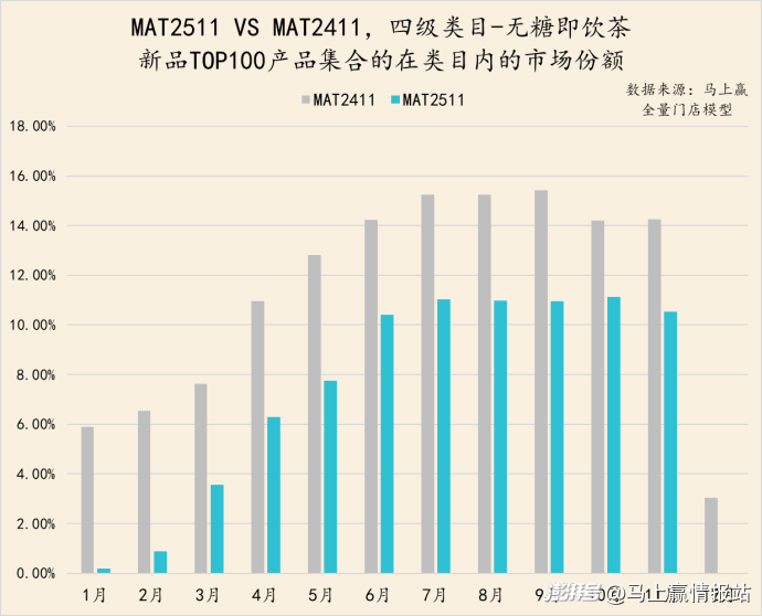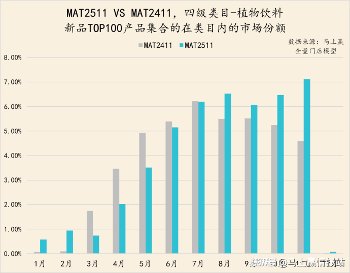 具體到植物飲料類(lèi)目情況則有所不同。MAT2511的TOP新品集合市場(chǎng)份額表現(xiàn)要好于MAT2411的TOP新品表現(xiàn),且在氣溫轉(zhuǎn)涼的10月、11月依然展現(xiàn)出了進(jìn)一步增長(zhǎng)的趨勢(shì),或是在熱飲適配方面有更好的表現(xiàn)。