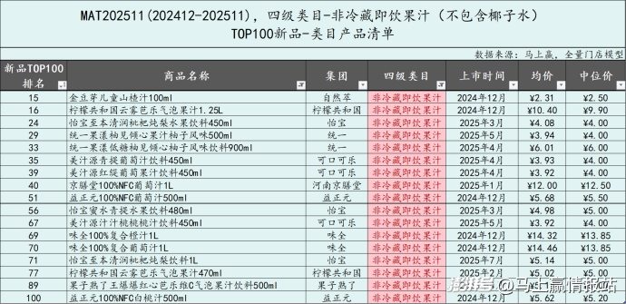 將所有在時(shí)間周期內(nèi)上市的SKU,以其在飲料大類(lèi)中的銷(xiāo)售額市占率進(jìn)行降序排列,取前100個(gè)SKU,限制條件為不含自有品牌產(chǎn)品、不含組合裝(內(nèi)裝數(shù)>1的套組、箱、禮盒等),數(shù)據(jù)模型為馬上贏全量門(mén)店模型。