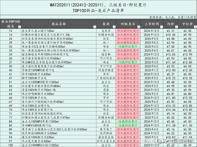2025年已經(jīng)接近尾聲,未來(lái)兩周馬上贏情報(bào)站也將開(kāi)啟“年終盤(pán)點(diǎn)模式”。與往年類(lèi)似,今年的年終盤(pán)點(diǎn)系列依然從飲料新品開(kāi)始,通過(guò)回顧2024年12月-2025年11月飲料市場(chǎng)的TOP100單品,以及與上一年同一時(shí)間段的對(duì)比,來(lái)觀察在過(guò)去一年,飲料市場(chǎng)有什么新的趨勢(shì)與走向。在下一周,我們將對(duì)飲料各類(lèi)目中的TOP集團(tuán)及其份額變動(dòng)進(jìn)行盤(pán)點(diǎn),敬請(qǐng)關(guān)注!