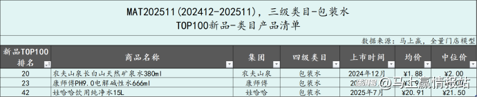 包裝水類(lèi)目共有3款新品上榜MAT2511新品TOP100,農(nóng)夫山泉、康師傅和娃哈哈各有一款產(chǎn)品上榜,規(guī)格從380ml到15L,跨度非常之大。