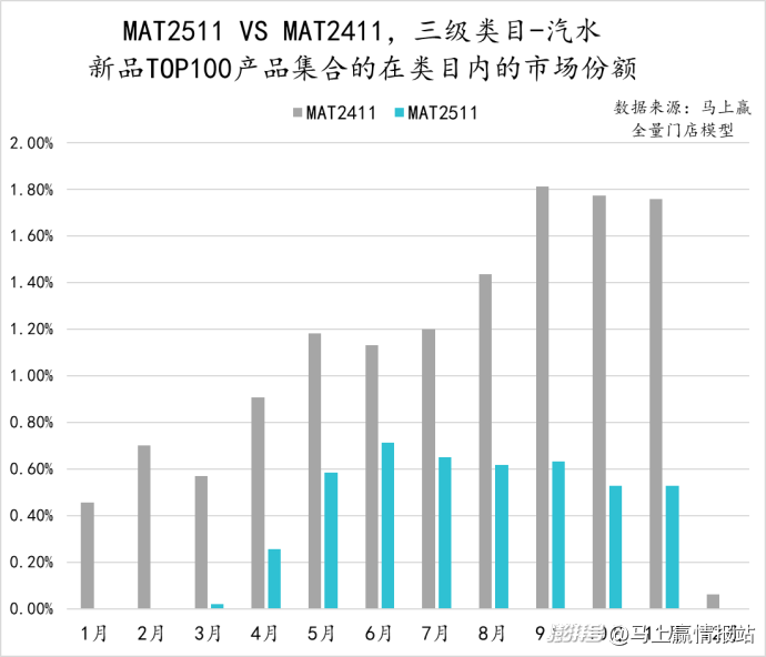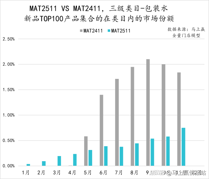 從包裝水類(lèi)目?jī)?nèi)TOP100新品的各月市場(chǎng)份額來(lái)看,MAT2511與MAT2411相比明顯表現(xiàn)更弱,或許也與去年的TOP新品中有農(nóng)夫山泉的“綠水”有關(guān)。不同于MAT2411的市場(chǎng)份額快速攀升,MAT2511市場(chǎng)份額始終未超過(guò)1%,旺季表現(xiàn)平平。