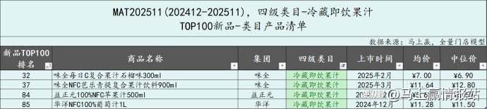 即飲果汁類(lèi)目是MAT2511時(shí)間段中,TOP新品最多的類(lèi)目,合計(jì)達(dá)到了30款,其中冷藏即飲果汁4款,非冷藏即飲果汁26款,我們分開(kāi)來(lái)看。