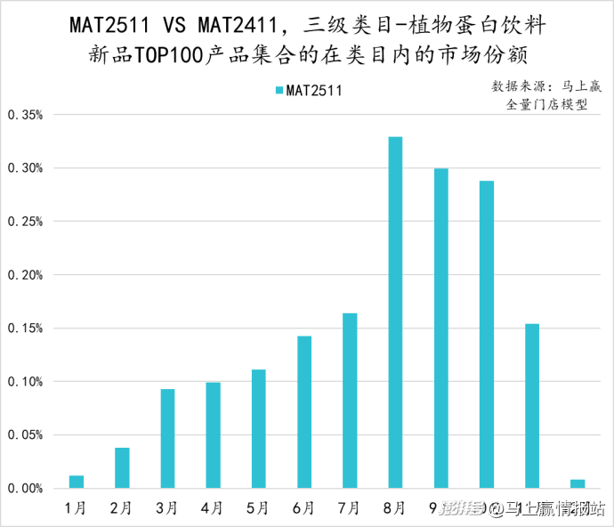 相比MAT2411,MAT2511植物蛋白飲料在TOP100新品中取得了0的突破。由于兩款新品上市時(shí)間分別為2024年12月和2025年7月,因此在8月產(chǎn)品集合迎來(lái)了市場(chǎng)份額峰值,但整體市場(chǎng)份額依然較低不足0.35%,且在隨后的9-11月呈現(xiàn)明顯的下滑。