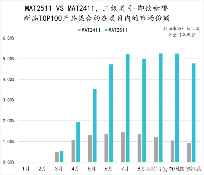 從即飲咖啡類(lèi)目中,TOP100新品的市場(chǎng)表現(xiàn)來(lái)看,相比MAT2411,MAT2511的表現(xiàn)明顯更好,新品集合自4月起市場(chǎng)份額就超過(guò)了MAT2411新品的表現(xiàn)。同時(shí),類(lèi)目中的TOP新品集合在2025年11月已經(jīng)占據(jù)了5%左右的市場(chǎng)份額,新品成長(zhǎng)性表現(xiàn)較好。