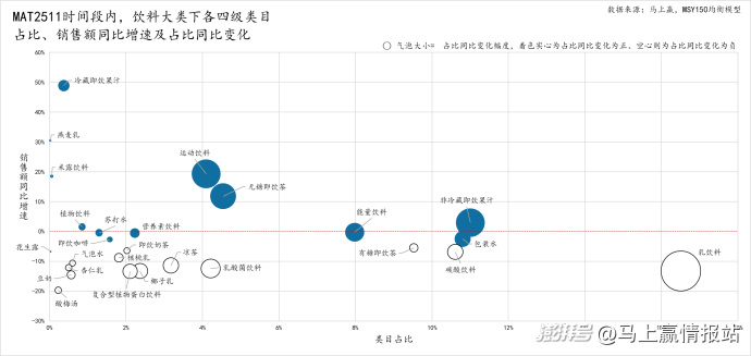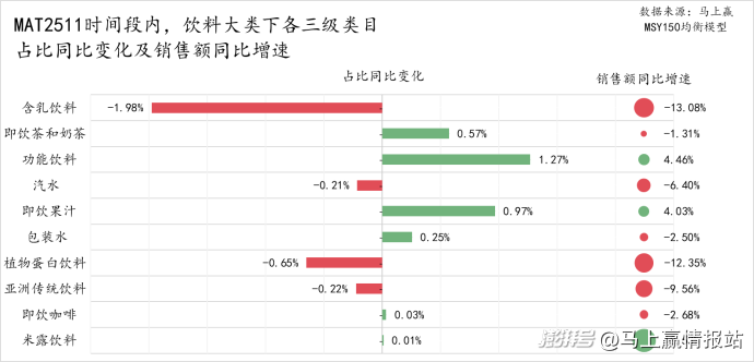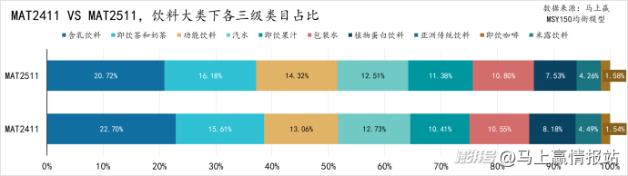 首先來(lái)看各三級(jí)類(lèi)目在MAT2511、MAT2411兩個(gè)時(shí)間段的占比,含乳飲料是飲料大類(lèi)中唯一占比超過(guò)20%的類(lèi)目,即飲茶和奶茶、功能飲料、汽水、即飲果汁和包裝水的占比均超10%,植物蛋白飲料占比約8%、亞洲傳統(tǒng)飲料(涼茶、酸梅湯、植物飲料等)占比約4.5%,即飲咖啡占比約1.5%,米露飲料占比不足0.1%。
