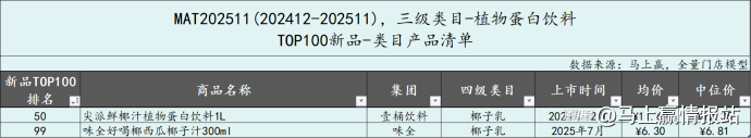 植物蛋白飲料類(lèi)目?jī)H有2款產(chǎn)品進(jìn)入新品TOP100,分別來(lái)自壹桶飲料和味全,兩款產(chǎn)品均為椰子乳,排名均在50名及以后。