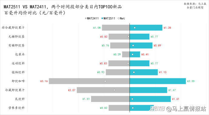 在TOP100新品的價(jià)格變化與表現(xiàn)上,我們穿透規(guī)格,以MAT2511、MAT2411部分TOP新品較多的類(lèi)目為集合,通過(guò)百毫升均價(jià)的對(duì)比來(lái)觀察兩個(gè)時(shí)間段TOP新品的價(jià)格水平變化。