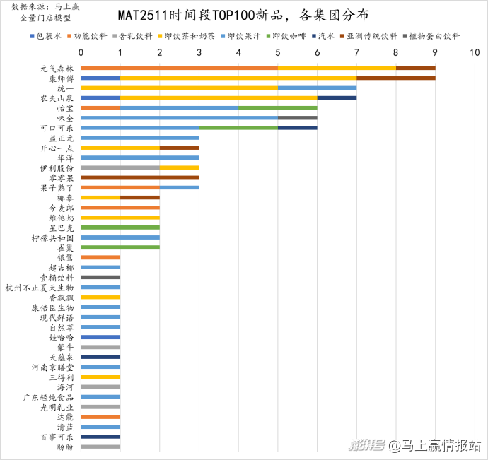 在MAT2511的飲料類(lèi)目TOP100新品中,還有高達(dá)20個(gè)集團(tuán)有1款新品上榜,其中既有老牌飲料集團(tuán),也有許多新鮮名字,值得進(jìn)一步觀察其未來(lái)表現(xiàn)。
