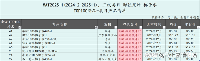 在即飲果汁類(lèi)目中,椰子水類(lèi)型產(chǎn)品也在今年的TOP新品中占據(jù)了相當(dāng)大的比例,共有8款產(chǎn)品在MAT2511進(jìn)入到TOP新品中。產(chǎn)品類(lèi)型都是100%椰子水產(chǎn)品,來(lái)自7個(gè)不同的集團(tuán),規(guī)格245ml到1L均有覆蓋。