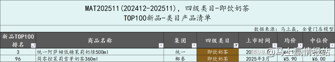 其中,即飲奶茶類(lèi)目共2款產(chǎn)品,一款為統(tǒng)一的阿薩姆奶茶茉莉奶綠口味低糖版,在整個(gè)TOP100新品中排名第三。另一款產(chǎn)品則來(lái)自椰泰。