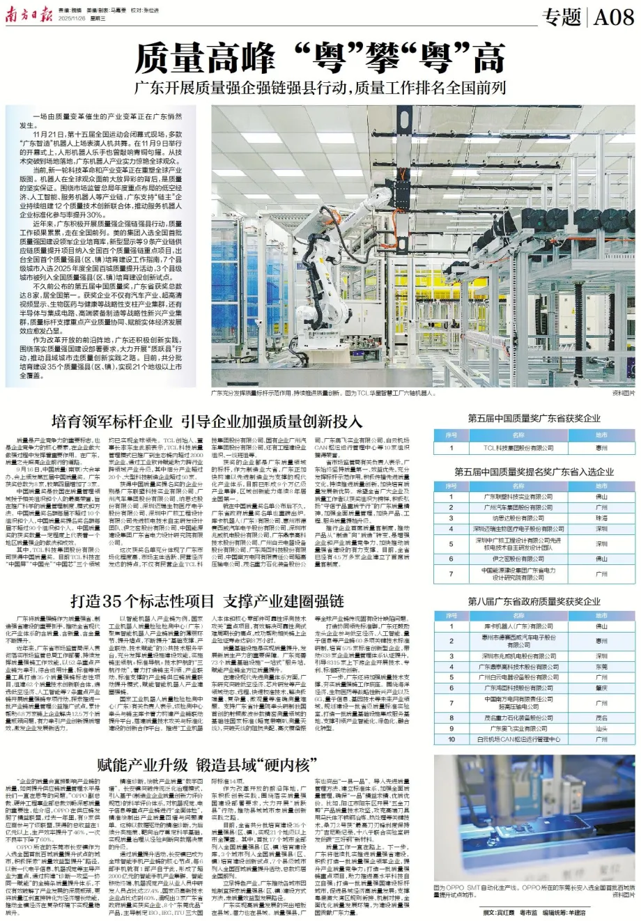2025年11月26日,《南方日?qǐng)?bào)》A08版刊登《質(zhì)量高峰 “粵”攀“粵”高 廣東開展質(zhì)量強(qiáng)企強(qiáng)鏈強(qiáng)縣行動(dòng),質(zhì)量工作排名全國前列》一文,全文如下。