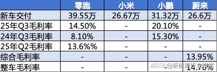 數(shù)據(jù)顯示,2025年三季度,零跑毛利率提升至14.5%。作為對比,其毛利率在2024年同期為8.1%,在2025年第二季度為13.6%;小鵬汽車毛利率20.1%,同比提升4.8個(gè)百分點(diǎn),這也是小鵬汽車毛利率首次突破20%;蔚來三季度綜合毛利率13.9%、整車毛利率14.7%。李斌在三季度后的電話會上提到,未來公司的整體毛利率預(yù)計(jì)將達(dá)到18%。