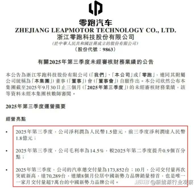 其中,零跑的成績最為亮眼。根據(jù)零跑披露的三季報(bào)顯示,報(bào)告期內(nèi),公司實(shí)現(xiàn)營收194.5億元,較2024年同期的98.6億元同比增長97.3%。同時(shí),繼2025年上半年首次實(shí)現(xiàn)半年度凈利潤轉(zhuǎn)正之后,零跑在三季度實(shí)現(xiàn)單季度盈利1.5億元,前三季度凈利潤1.8億元。