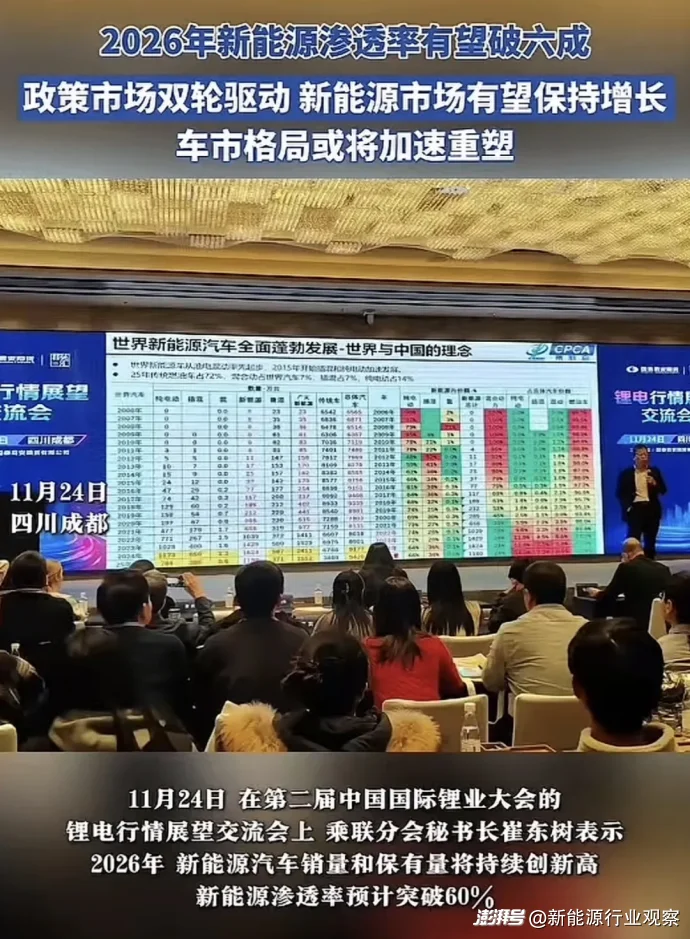 從產(chǎn)銷規(guī)模來看,乘聯(lián)分會秘書長崔東樹在11月提到,2026年,新能源汽車銷量和保有量將持續(xù)創(chuàng)新高,新能源滲透率預(yù)計(jì)突破60%。